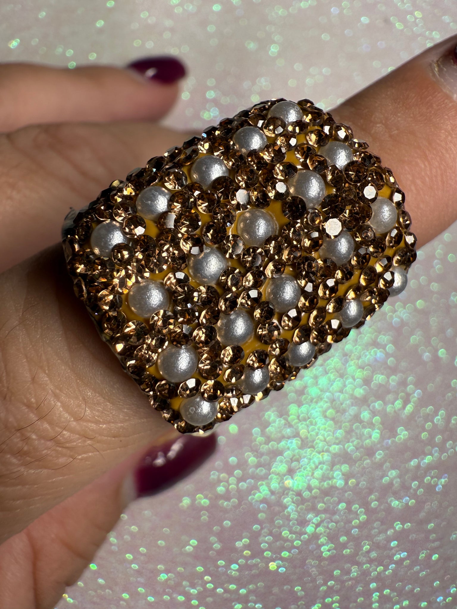 Una pieza única y llamativa que combina la elegancia de las perlas con el brillo de cristales dorados. Su diseño cuadrado realzado con textura artesanal la convierte en el accesorio perfecto para destacar cualquier look, desde casual chic hasta un outfit de noche.